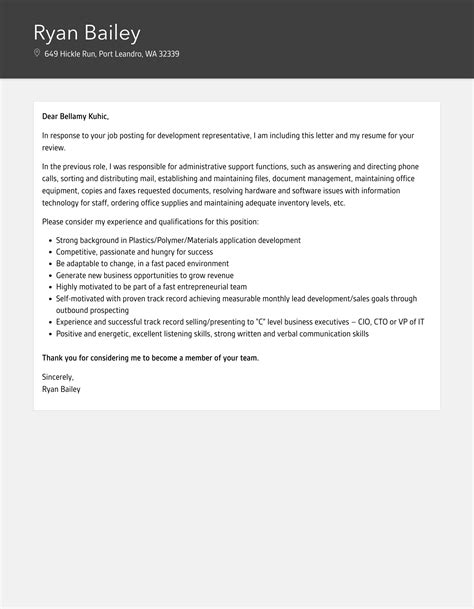 Trade Development Representative Cover Letter - 14 sales development representative cover letters. As a sales development representative, kick off your cover letter with a compelling hook, such as a notable achievement that quantifies your sales. Get ready to elevate your job application and stand out from the competition with our curated collection of cover letter examples: Craft an exceptional sales development representative cover letter with our.